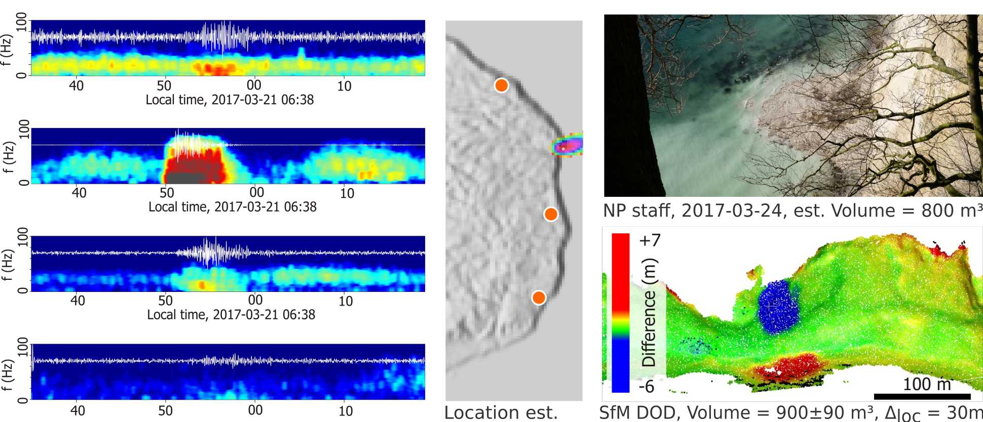 The plots below show the spectrograms of four seismic station that have recorded a cliff collapse. The time delay with which the seismic wave, emitted by the collapsing mass, arrives at each station (offset of the red colours along the x-axis) allows locating the source and its occurrence time. The lower right panel shows a 3D model of the detached mass (blue colours) and its deposit at the beach (red colours).