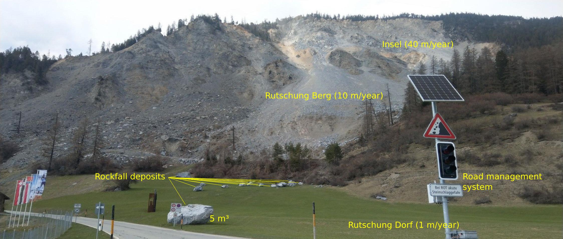 A 10–20 Million cubic metre large slope instability sits above an Alpine Village in Grisons, Switzerland. Despite the pitoresque scenery of Brizauls (or Brienz, though not the city of Brienz near Interlaken) there is a complex geomorphic crisis looming. While being on the move for thousands of years, the entire slope has started accelerating throughout the last 15 years. The situation is a complex one. There are actually two slope instabilities: a relatively slow moving one (Rutschung Dorf) on which the village of Brinzauls is sitting, and which is sliding down slope by a few metres per year (or several mm per day), and a much more active one (Rutschung Berg) just above the village, which has been moving at a comparable pace as the Rutschung Drof but that started accelerating some 15 years ago to 5–10 m per year (several cm per day). One part of Rutschung Berg, the "Insel", an about 2 Mio cubic metre large chunk, is currently accelerating exponentially, reaching values of more than 40 m per year (some decimetres per day). It is not (only) the gradual sliding process that causes problems, rather it is the rapid and unpredictable mass wasting processes that are triggered by that movement – rockfalls, block falls and rock avalanches – that pose the immediate threat to the village and the roads connecting it to the rest of Switzerland. The annotated photo below depicts that situation as seen from the former school building at the western entrance to the village.