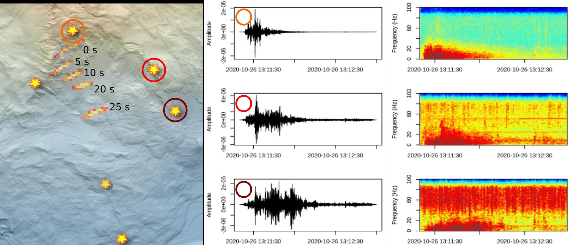 The above panel shows the instable landscape in 2020, where the Rutschung Berg in the North is surrounded by four seismic stations and two stations are located on the Rutschung Dorf. The seismograms (middle panel) and spectrograms (right panel) of one small rockfall event are shown as recorded by the three eastern seismometers. Note how different the three seismograms look beause the rockfall is propagating along slope (orange polygons on map with time stamps), thereby emitting different amounts of energy and changing its distance to each sensor. However, a new tracking technique (cf. Cook et al., 2021) allows to account for that and deliver a robust trajectory of the mobile mass.