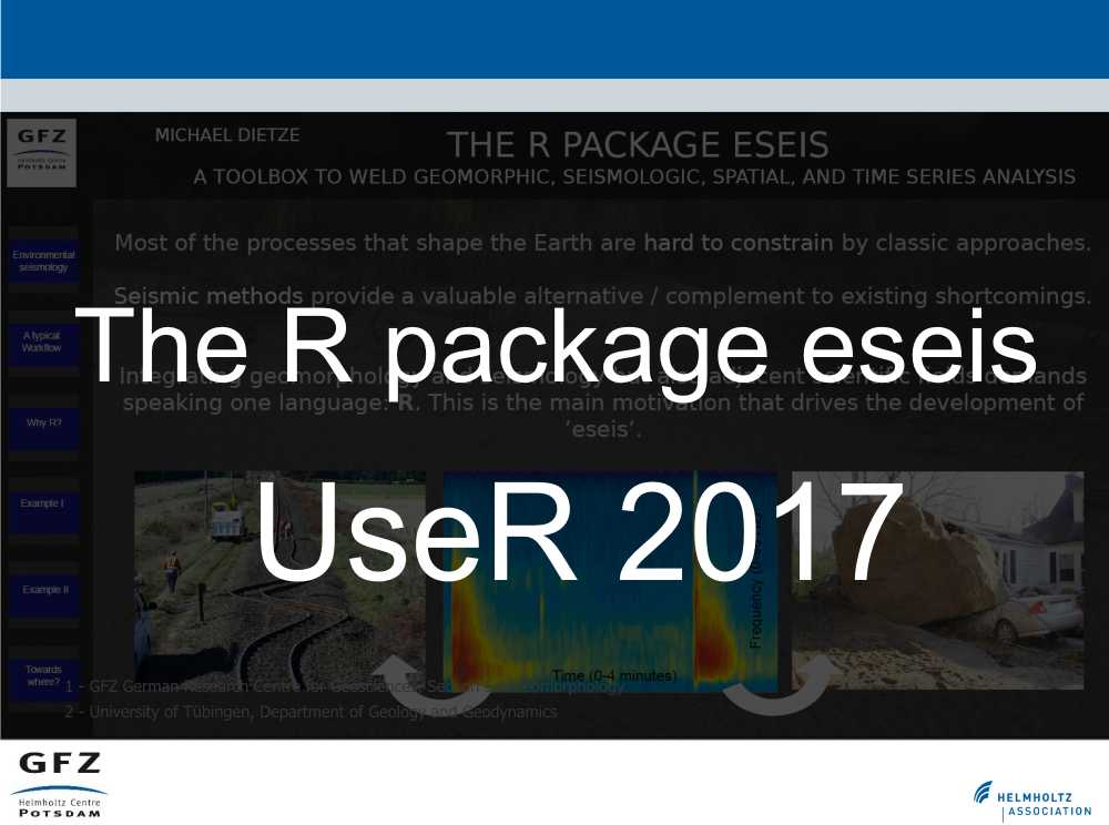 Environmental seismology is based on a massive amount of ground vibration measurements. A single seismic station generates two million samples per hour. Over the decades, seismologists have developed complex, high performance methods to analyise these signals; a pool of tools environmental seismology deliberately benefits from. In order to provide a straightforward tool box to process seismic data, tailored to the investigation of Earth surface dynamics, dedicated to free and open software, and suporting to pass the results to further environmental analysis, the R package eseis has been developed (Dietze, 2018). See eseis website for details.